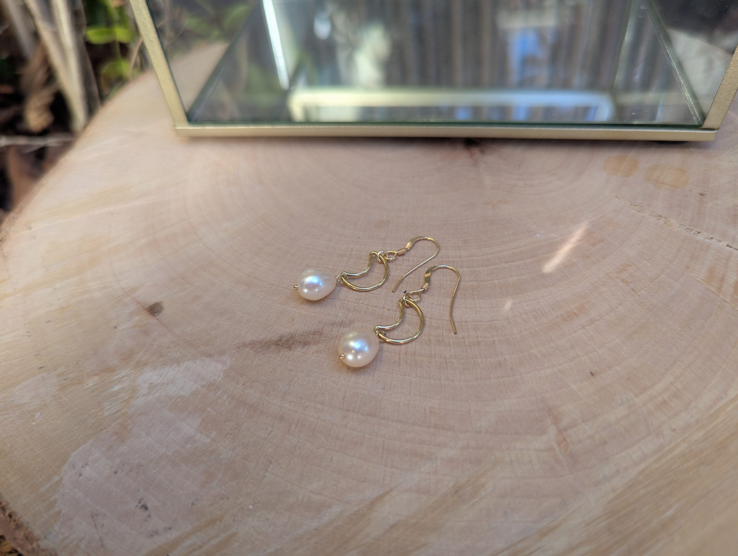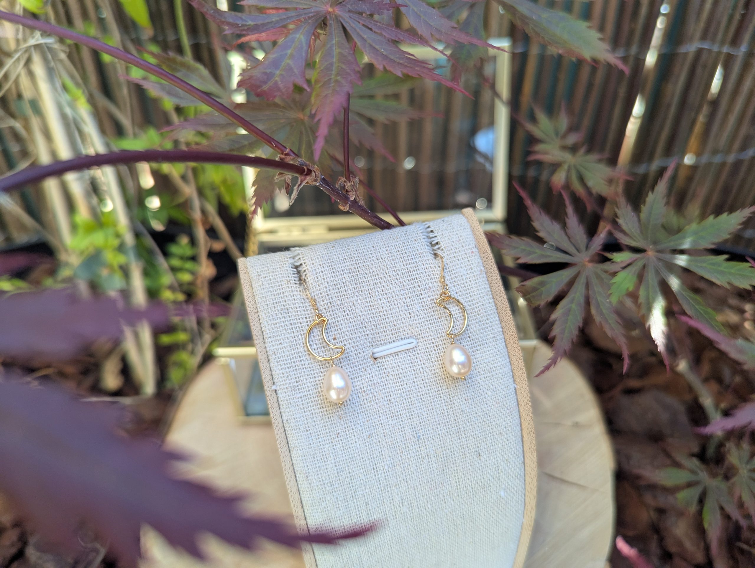 Boucles pendantes lune en goldfilled 14K et perle rose
