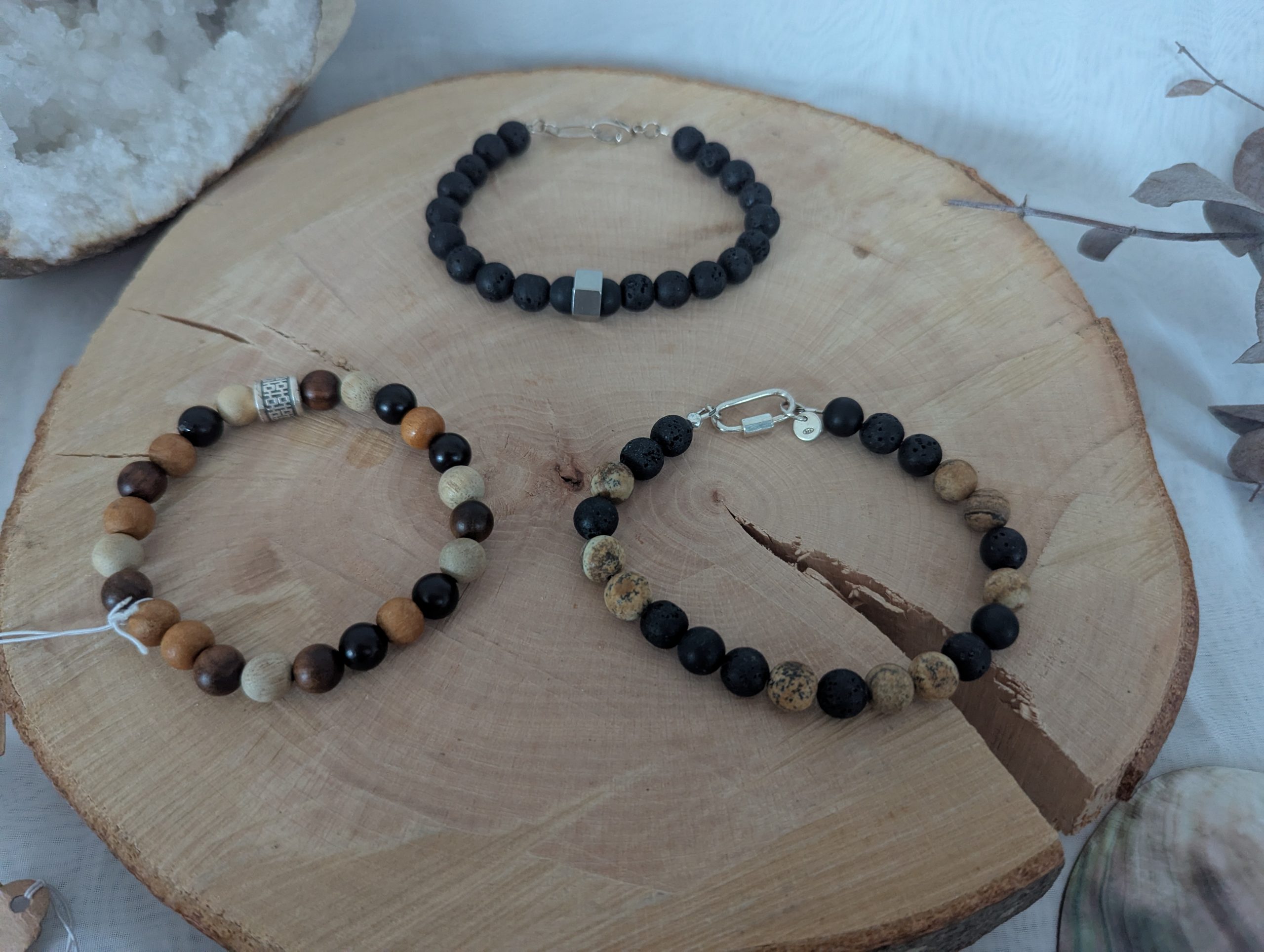 – Devant à droite : perles de lave et perles de bois 8mm, fermoir en argent 925/1000e
