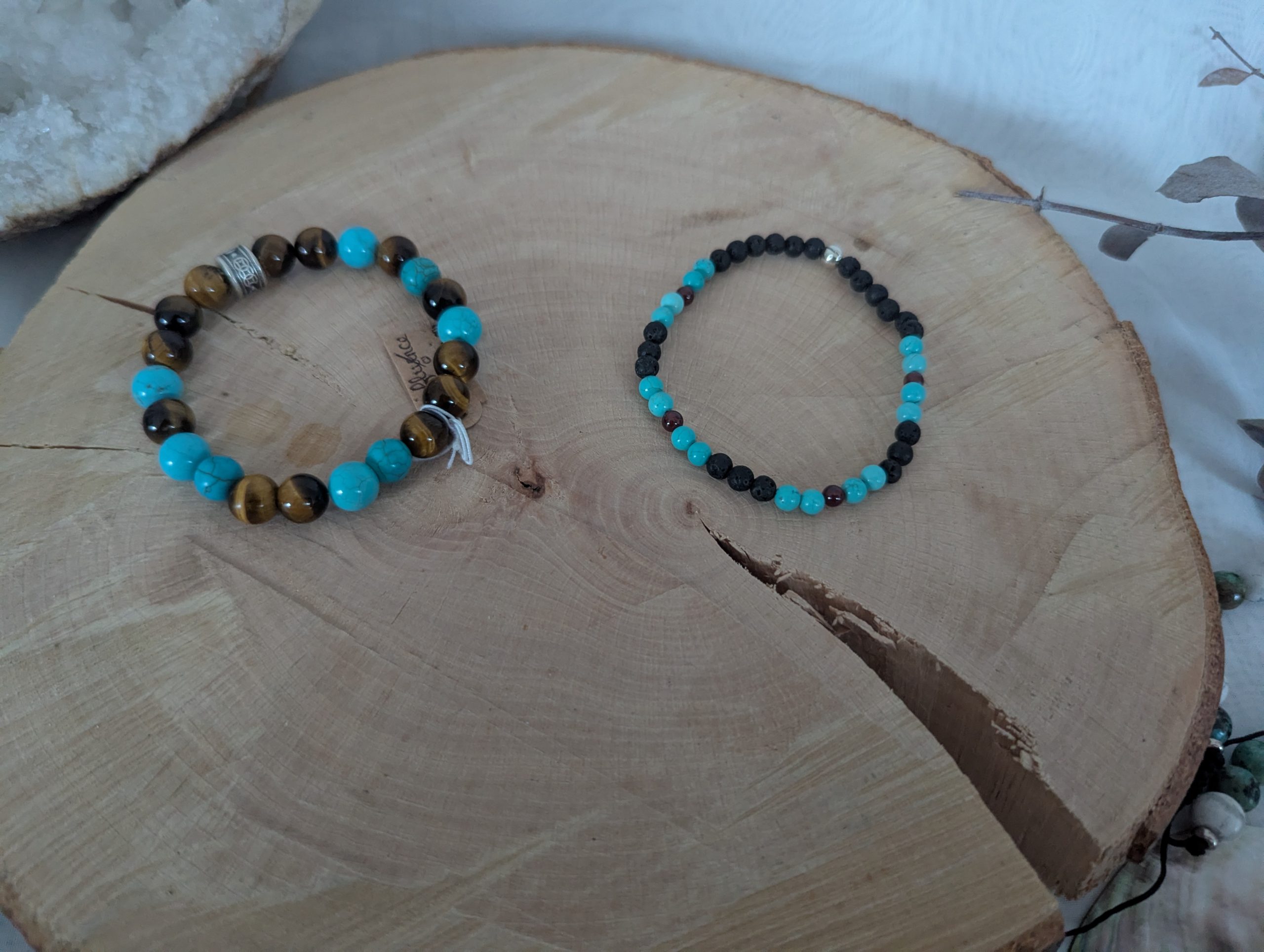 – bracelet de gauche : perles 8 mm en turquoise et oeil de tigre, argent nickelé