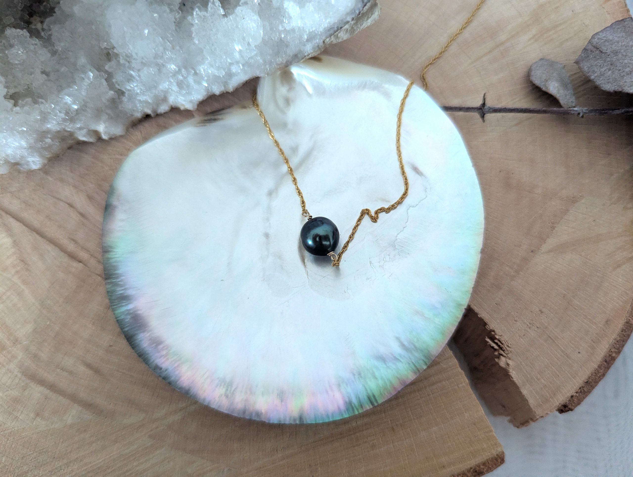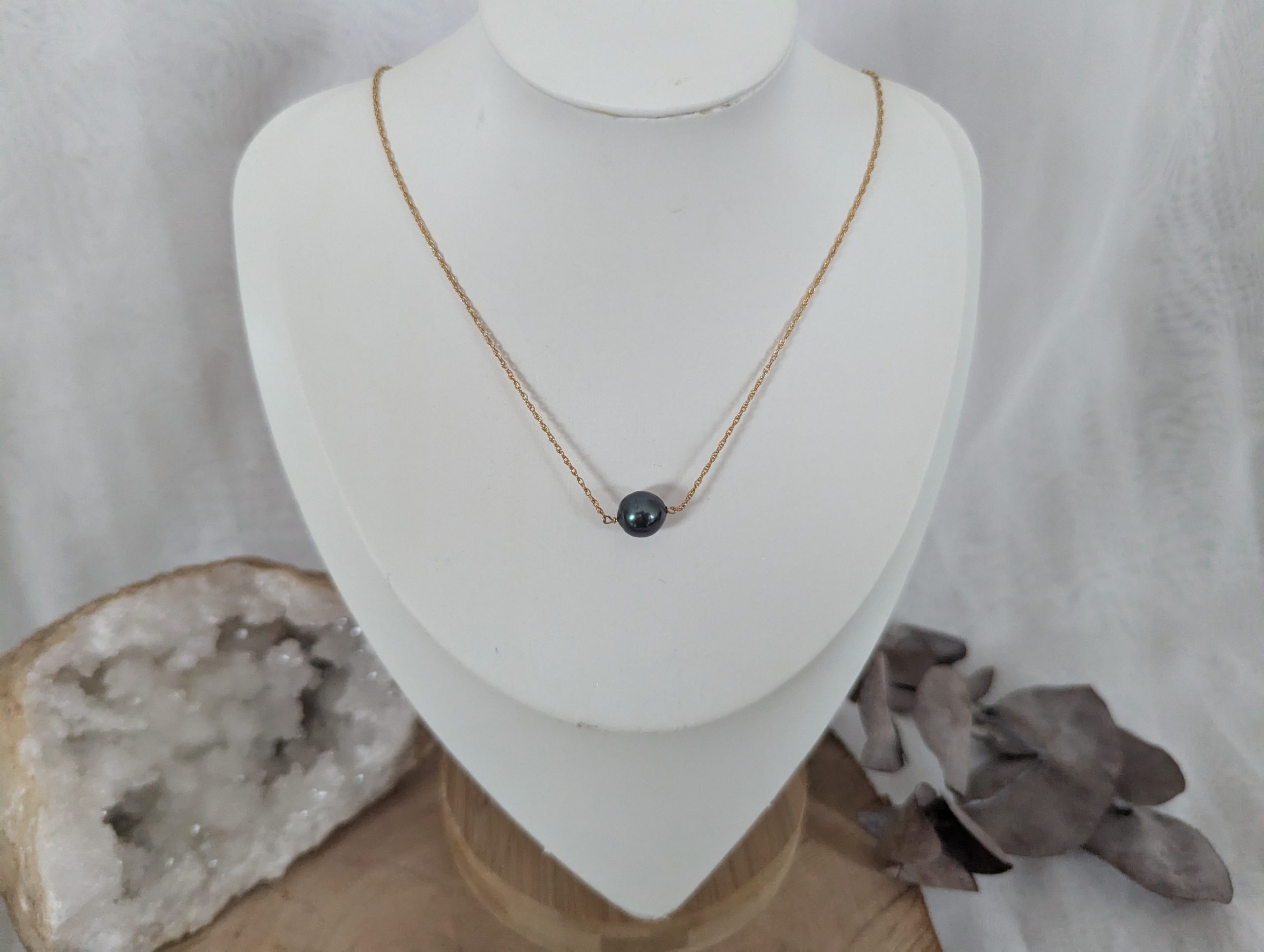 Description à venir Collier en goldfilled or 14K Perle de Tahiti cerclée, qualité A/B, couleur gris / verte