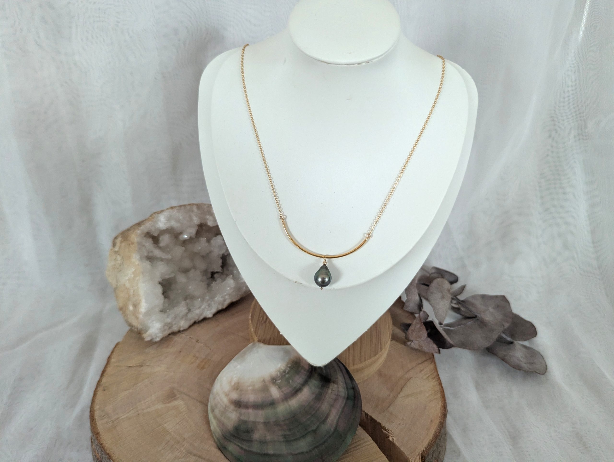 Description à venir Collier en goldfilled or 14 K Perle de Tahiti cerclée, 9-10 mm, qualité A/B, couleur gris / vert