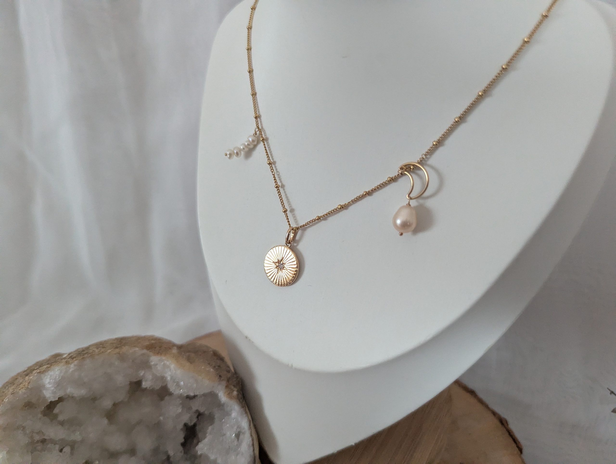 Description à venir Chaine boules goldfilled or 14K Breloque en plaqué or Perles blanches 3 mm et perle ovale rose